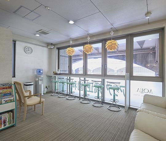 大きな窓から自然光が差し込む明るく開放的なスペースです。外側へ向いたカウンター席やチェアは、まるでカフェのようにおしゃれです。備え付けの雑誌を読みながら、リラックスして診療を待つことができます。