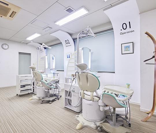 明るく清潔感にあふれ、圧迫感のない開放的な空間です。チェアとチェアの間に簡単なパーティションを設置し、患者のプライバシーに配慮しています。矯正治療のほか、予防処置やホワイトニングなども行う診療スペースです。