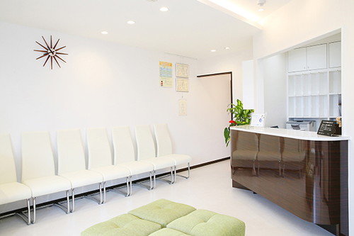 真っ白で健康的な歯をイメージさせるようなチェアの並び。ダークブラウンの受付やライトグリーンの腰かけなど、全体的なカラー配色のセンスが光ります。余分なものを一切置かず清潔感を強調。院内感染の予防にも力を入れています。