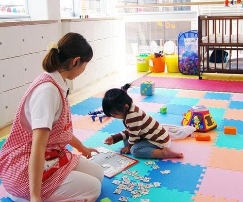 保育士が常駐する2階のキッズルーム。明るく陽当たりの良い環境の中、保育士がお子さまの安全を見守りながら一緒に楽しい時間を過ごします。クリニックの患者さんなら無料で利用できる保育サービスです。