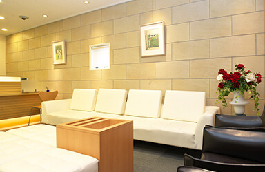 待合室にはゆったりとしたソファが置かれ、淡いベージュの壁と合わせて落ち着いた雰囲気がつくられています。