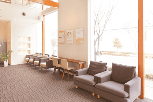 明るくて温かな雰囲気の待合室です。大きなガラス面から自然光が差し込み、窓の外に広がる和やかな景色も心を和ませてくれます。