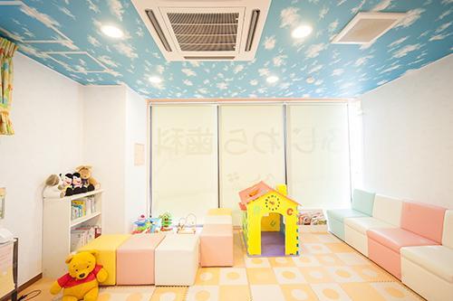 明るいプレイルームには、カラフルな遊具やぬいぐるみ、本棚が並び、天井には青空模様が描かれています。保育士が常駐しているため、小さなお子さまも待つことができます。親御さんも自分の治療に集中できます