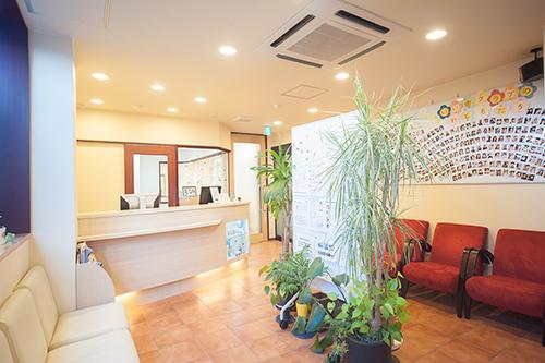木目を基調とした温かみのある内装で、中央には観葉植物が配置され、落ち着いた雰囲気づくりがなされています。待合室の壁には、患者との思い出を写した写真が掲示されており、地域とのつながりを感じられる工夫が見られます。