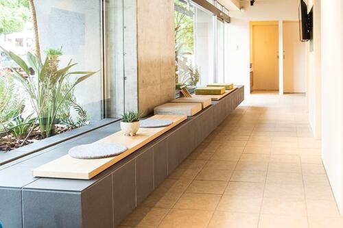 ガラス越しに植栽が見える明るい待合スペース。大きな窓からは自然の光がやさしく差し込み、清潔感と落ち着きが調和した空間です。シンプルながらも洗練されたデザイン空間は、診療前の緊張を和らげてくれます。