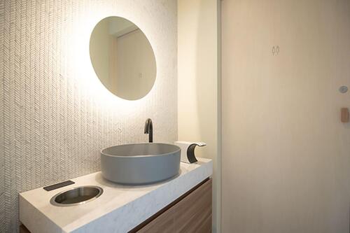 治療前後の歯磨きや化粧直しに利用できます。待合室や施術室と同様、シンプルながらも洗練されたデザインが特徴です。