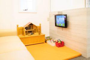 柔らかいマットが敷かれた子供にやさしいキッズスペースです。モニターにはアニメなどの映像が流されており、保護者の治療中も過ごしやすい環境が整えられています。