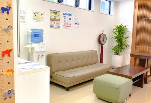 柔らかなベージュのソファと木目調のインテリアが印象的な待合室。お子さんも多く通うクリニックなので、待合室内には身長・体重の測定機も設置しています。ウォーターサーバーも自由に利用できます。