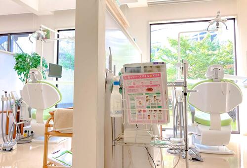 大きな窓から自然光がたっぷりと差し込む明るい診療室。圧迫感を与えないレイアウトとやわらかなグリーンの診療チェアで、リラックスして治療を受けることができます。衛生管理も徹底された診療室です。