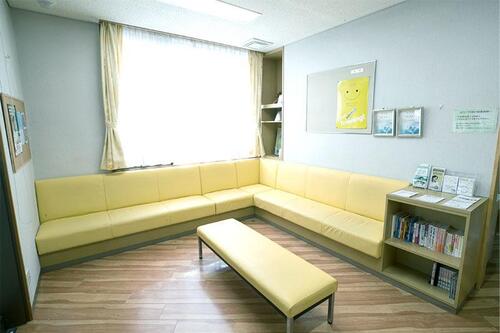 淡い黄色のソファと木目調の床が目にやさしい待合室。大きな窓から自然の光が注ぐ明るい空間です。