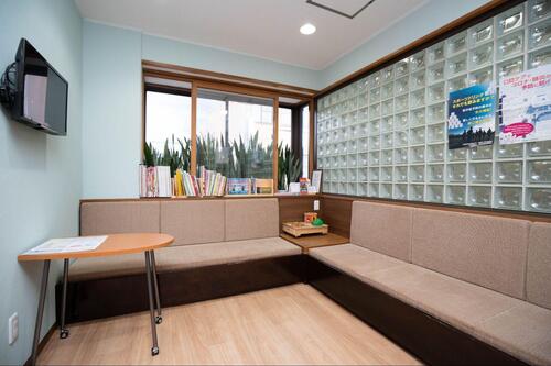 穏やかなブラウンと爽快な水色を基調とした待合室。治療への緊張を少しでも緩和させるため、診療スペースとの区切りをなくした開放的なレイアウトです。お子さんが退屈しないよう、絵本やおもちゃも常備しています。