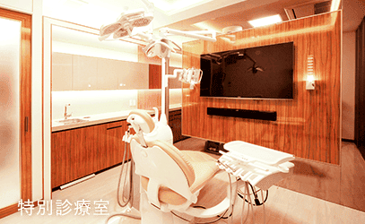 統一された木目調が美しい特別診療室。歯科治療を受ける場所とは思えないような高級感ただよう空間です。診療台の前には大型のモニターが設置され、モニターの画像を通じてドクターが症状を分かりやすく説明します。