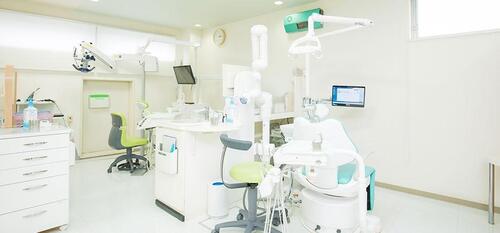 白を基調にした明るく清潔感のある診療室。奥の診療台にはマイクロスコープが設置され、精密な治療にも対応できます。