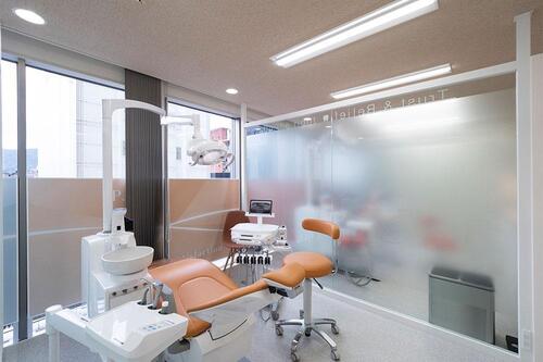 大きな窓から自然の光が注ぎ明るい診療室です。各診療台の間にはすりガラス状の大きなパーテーションが設けられているので、隣の患者を気にすることなく治療に集中できるように配慮されています。